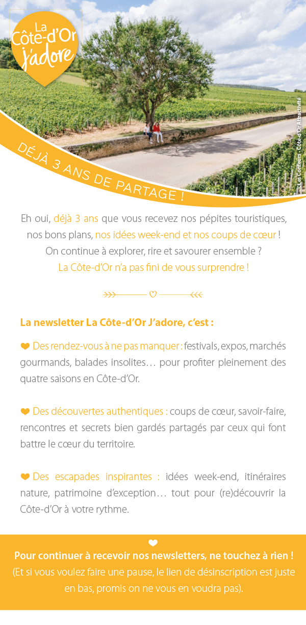 | | | | | | | | | | | | | | | | | Crédit photos : ©Freepik / @Côte-d'Or Attractivité / ©Rozenn Krebel / ©Abbaye de la Bussière / ©Serge Chapuis - Maison Prosper Maufoux / ©Relais Bernard Loiseau *L'abus d'alcool est dangereux pour la santé, à consommer avec modération Conformément à la loi « informatique et libertés » et au Règlement Général sur la Protection des Données (RGPD), vous pouvez exercer votre droit d'accès aux données vous concernant et vous désinscrire de nos newsletters à tout moment via le lien de désinscription ou en nous contactant via : https://www.lacotedorjadore.com. Pour plus d'informations sur nos pratiques de confidentialité, consultez notre site Web. | | | | | |